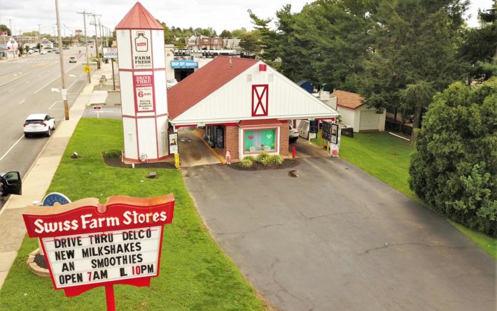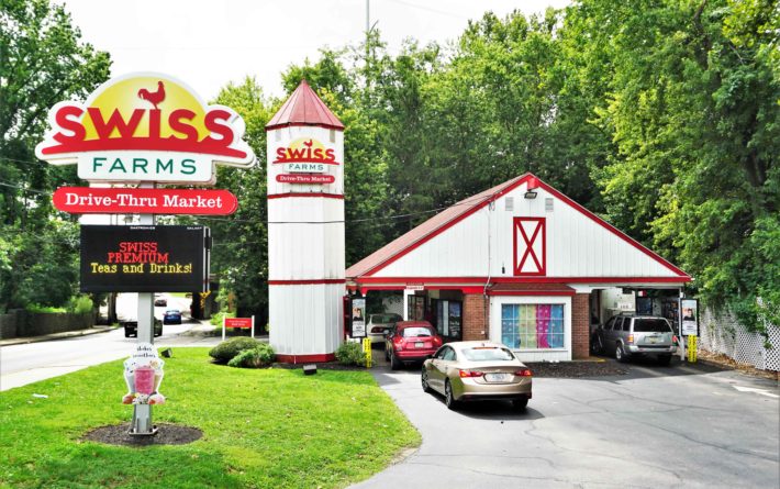 Swiss Farm Stores establishment with a strong presence in the community and convenient drive thru design.