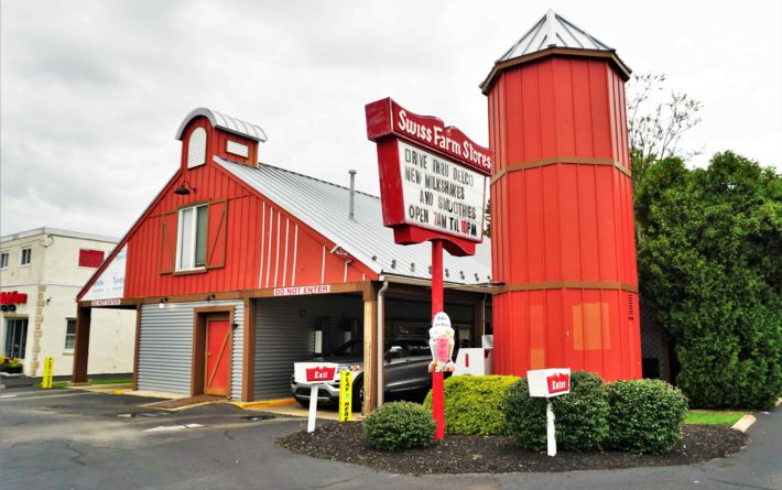 Swiss Farm Stores establishment with unique double drive-thru concept and commuter-friendly design.